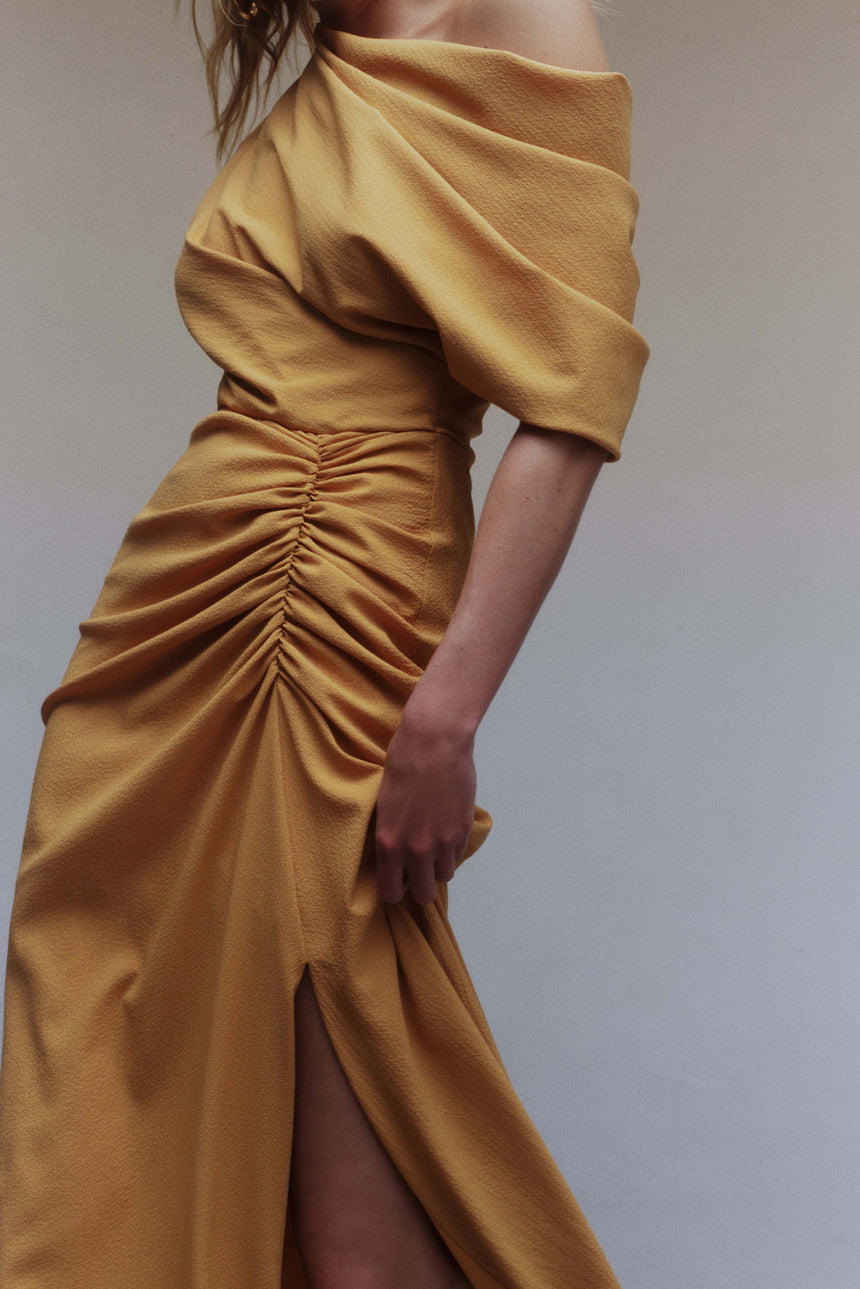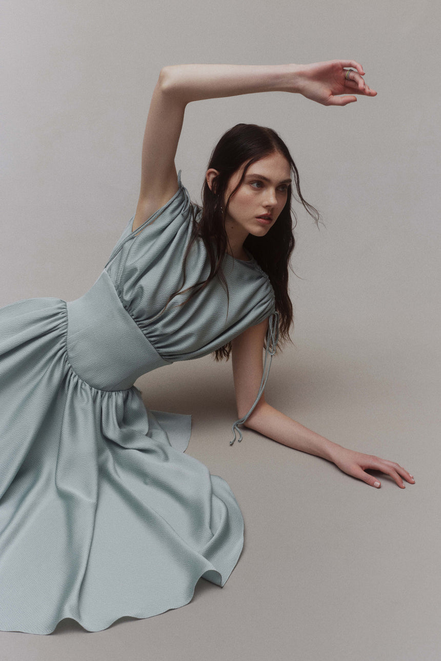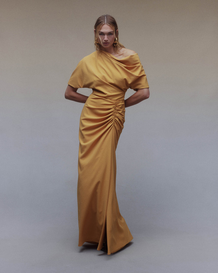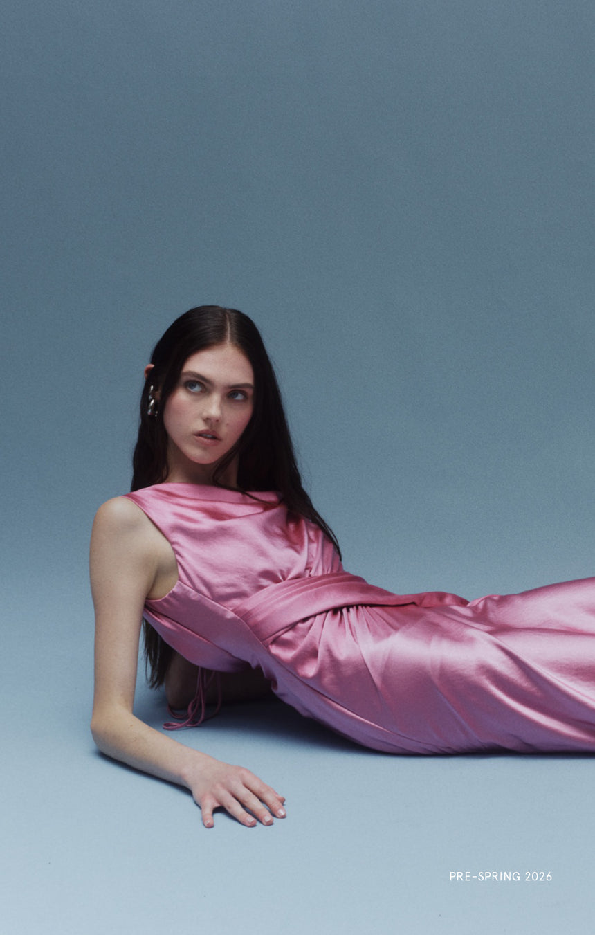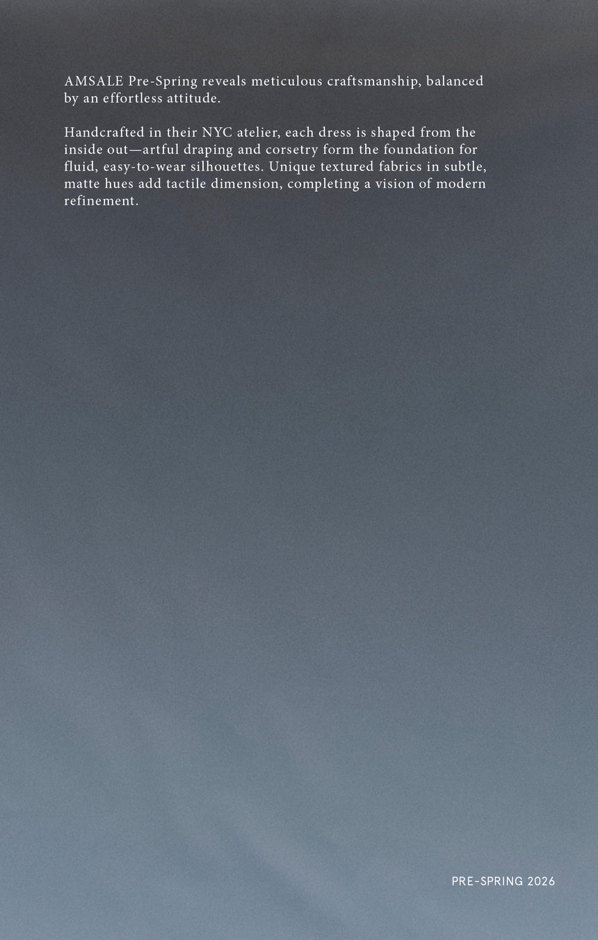 AMSALE Pre-Spring reveals meticulous craftsmanship, balanced by an effortless attitude. Handcrafted in their NYC atelier, each dress is shaped from the inside out—artful draping and corsetry form the foundation for fluid, easy-to-wear silhouettes. Unique textured fabrics in subtle, matte hues add tactile dimension, completing a vision of modern refinement.